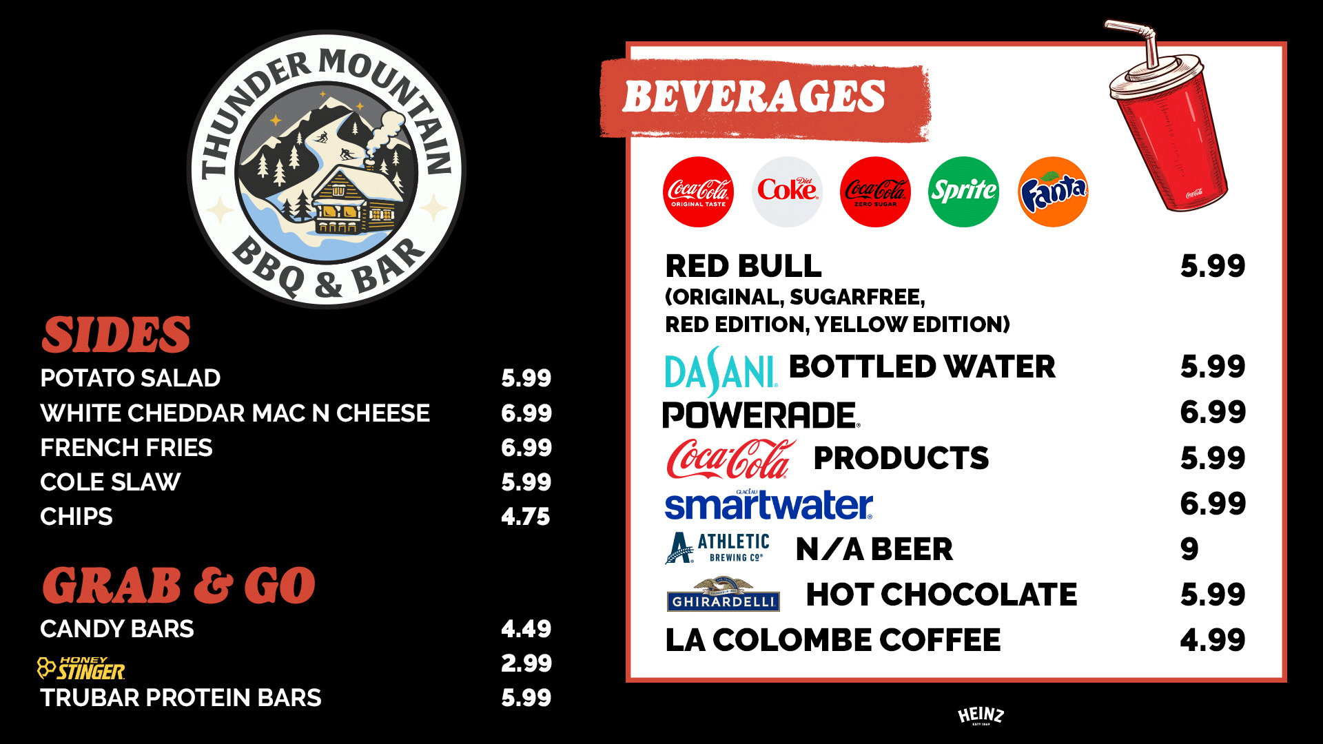 Since this location features a full bar, we won’t be posting specific cocktail, beer, or drink offerings on our website. Our drink menu changes regularly to highlight seasonal ingredients and local selections, so we invite you to visit in person to see what’s pouring!Thunder Mountain BBQ & Bar
