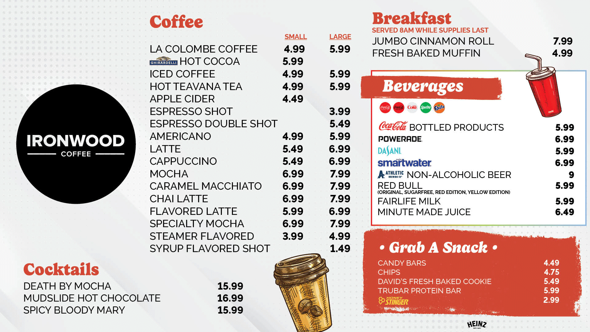 Stop by Ironwood Coffee before hitting the slopes and power up with coffee, breakfast pastries, muffins, and jumbo cinnamon rolls. For those craving something stronger, enjoy a spicy Bloody Mary or a signature cocktail like the indulgent Death by Mocha or Mudslide Hot Chocolate. Fuel up before your day on the slopes or stop by for a quick breather and take in the surrounding alpine setting. rich-text, responsive-tableaccordion, accordion-placeholderLocation