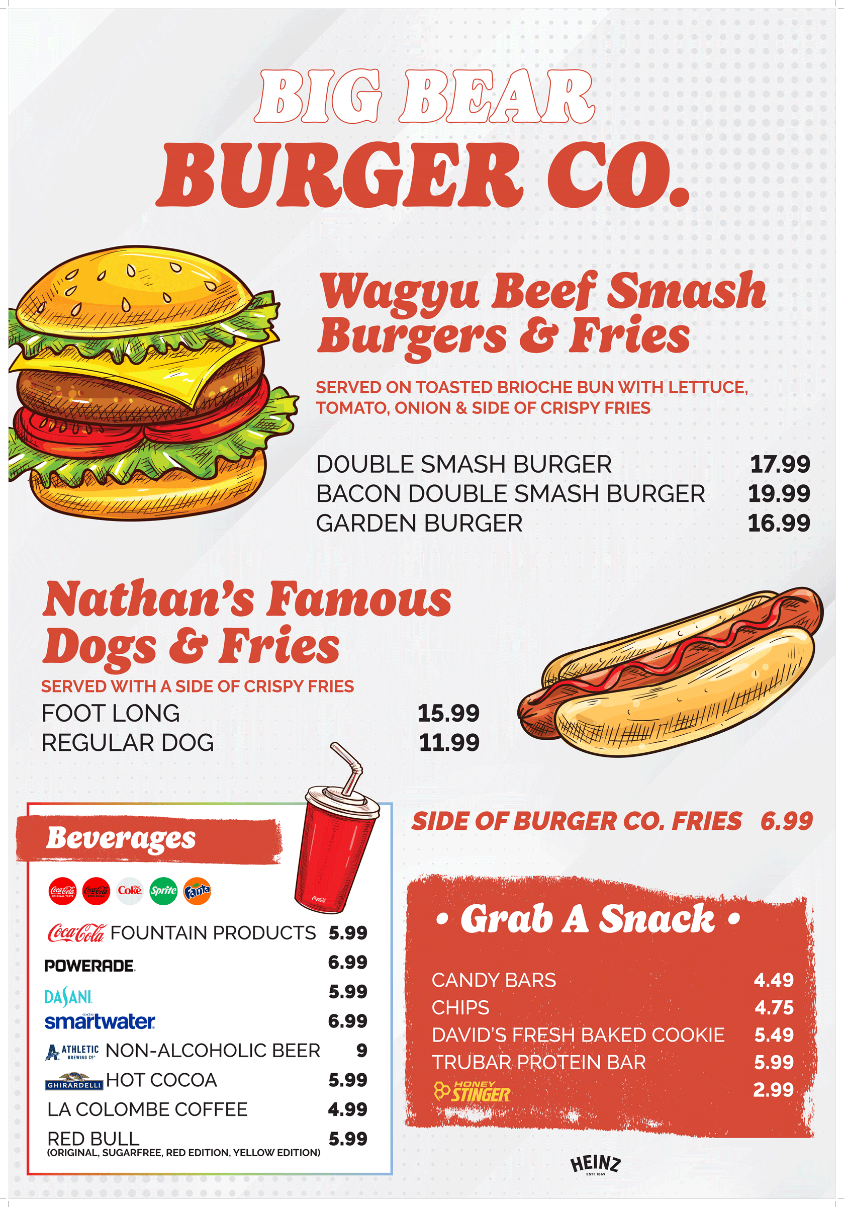 Stop by Big Bear Burger Co. for the ultimate mountain meal. Sink your teeth into house-blended wagyu and angus chuck 2x2 smash burgers, savory plant-based garden burgers, hot dogs, crispy fries, and more at this must-visit spot for burger lovers.