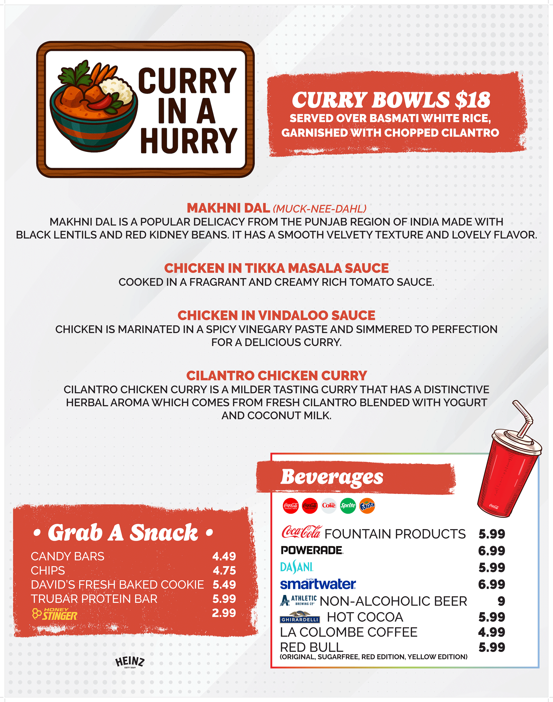 True to its name and then some, Curry in a Hurry serves four delicious curry varieties over fluffy white rice. Pair your meal with a selection of beverages, including fountain drinks, hot chocolate, adult beverages such as seltzers and ciders, as well as a variety of snacks. rich-text, responsive-tableaccordion, accordion-placeholderLocation