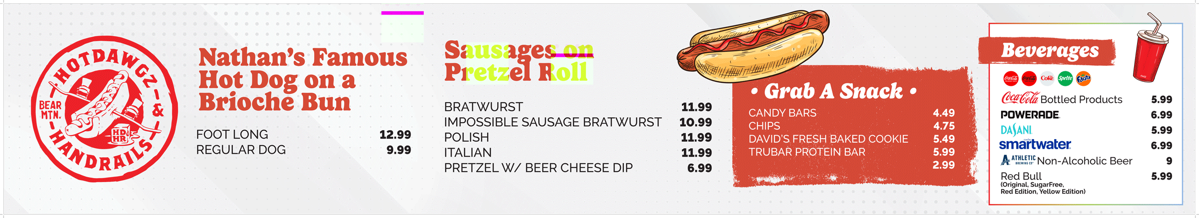 Inspired by Bear Mountain's iconic Hot Dawgs & Hand Rails event, this sun deck spot serves up the best hot dogs and sausages on the mountain. Whether you're craving the Foot Long or a classic Italian sausage, choose your favorite protein and top it off with over 12 delicious toppings. Pair it with a draft beer or a cold drink from the wide selection, then settle in on the sun deck for the perfect meal. rich-text, responsive-tableaccordion, accordion-placeholderLocation