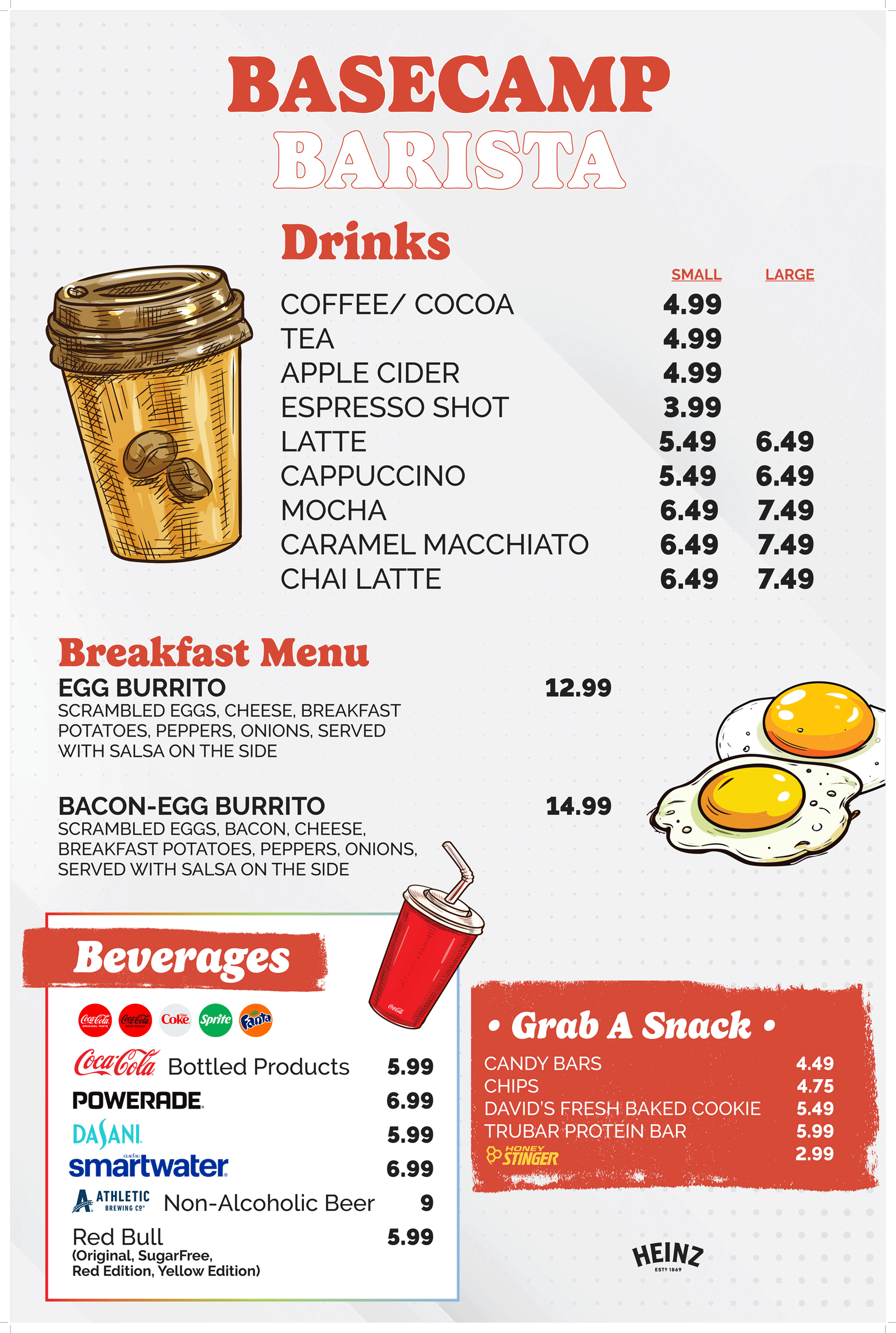 From casual comfort food to classic grab-and-go favorites, our locations are all about convenience and fueling your day, with scenic views and cozy vibes to match. While you won’t find gourmet dining here, you will find hearty meals, cold drinks, and friendly faces — all just steps from the lifts. rich-text, responsive-table