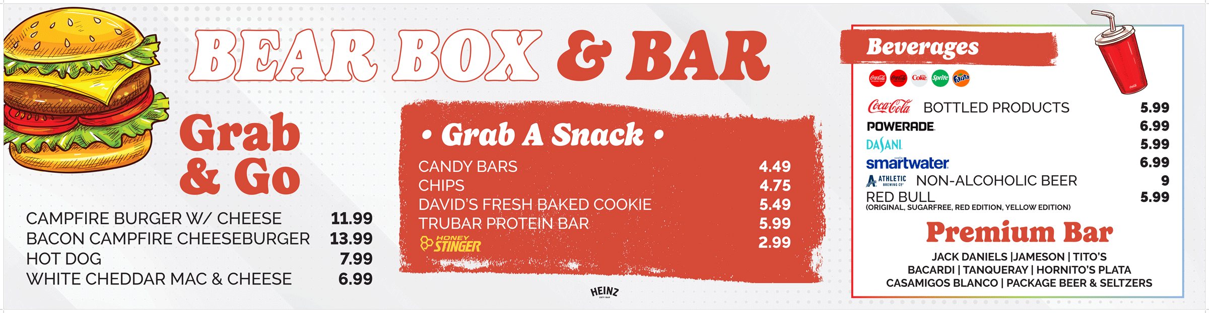 Need a quick bite before hitting the slopes again? Bear Box has you covered with a variety of grab-and-go options, including the Campfire Burger, hot dogs, and mac & cheese. Stop by for a fast refuel and get back out there in no time. rich-text, responsive-tableaccordion, accordion-placeholderLocation