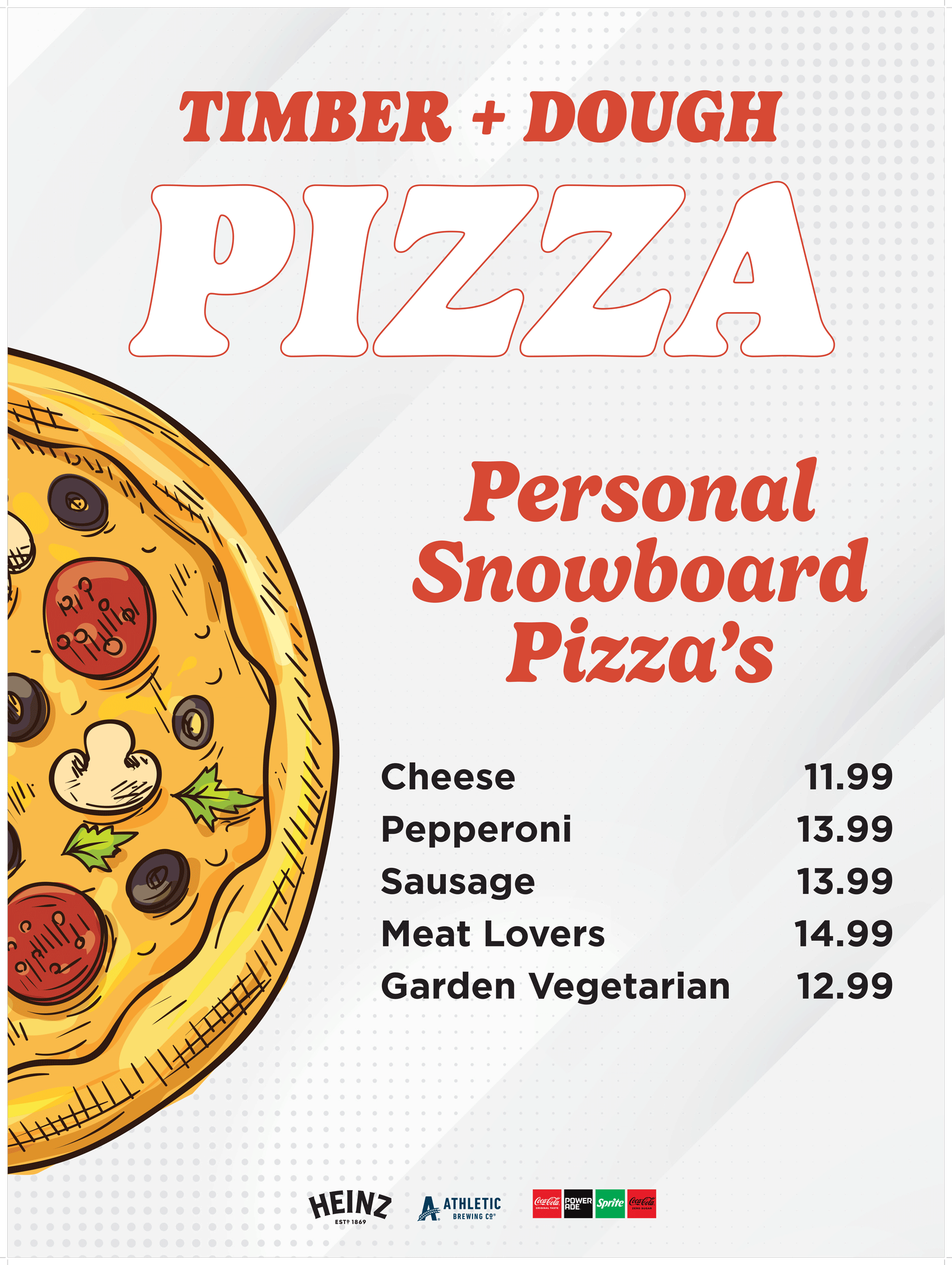 Timber + Dough is the perfect stop for a fresh slice of pizza between runs. All pizzas are made daily, with options ranging from cheese and pepperoni to sausage, meat lovers, and veggie. Conveniently located at the bottom of Chair 2, it’s the ultimate hot, fast, and ready to go option for when you need a quick bite. rich-text, responsive-tableaccordion, accordion-placeholderLocation