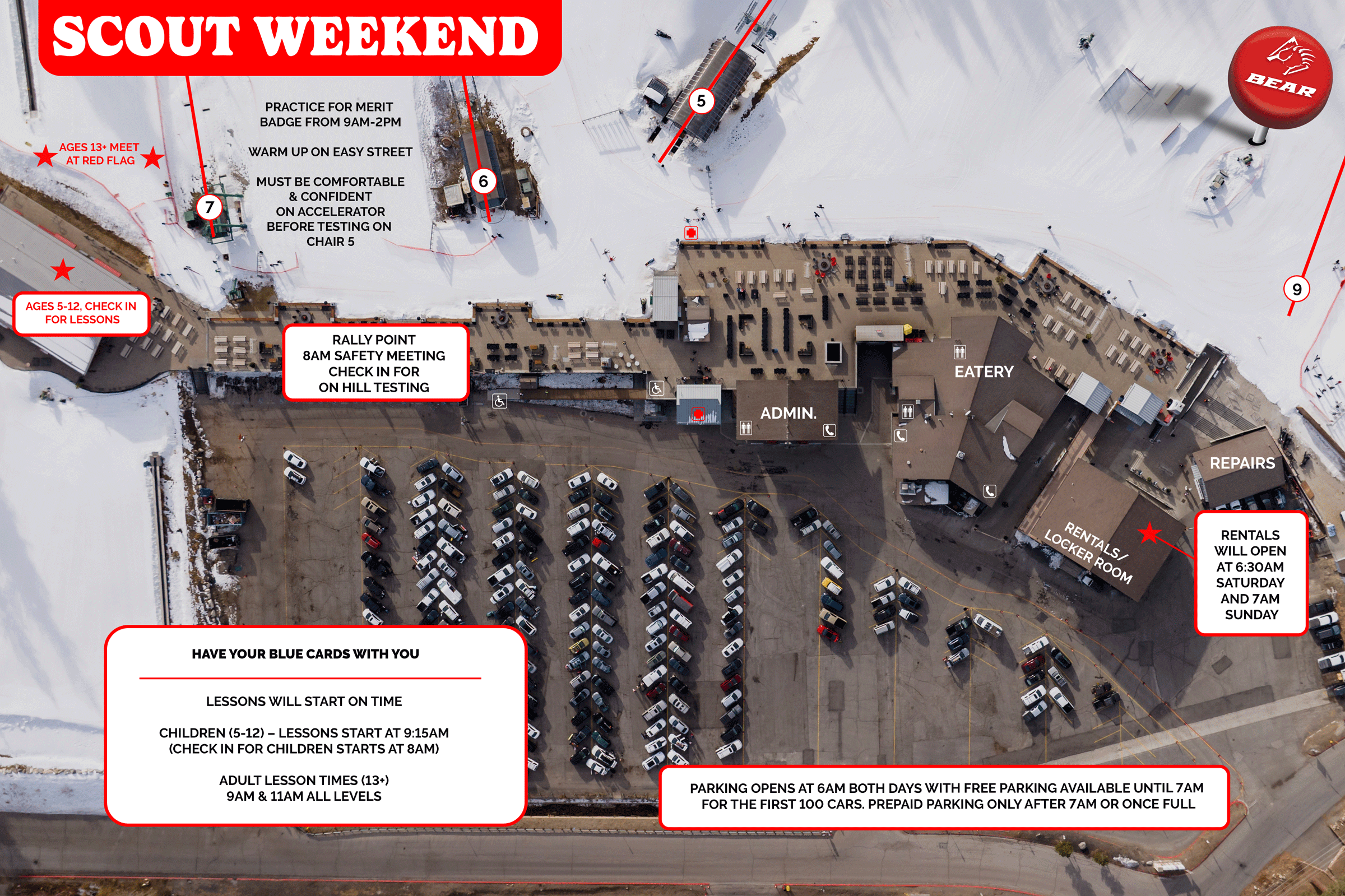 Volunteer Snow Sports Merit Badge counselors will be available to evaluate Scouts. If you would like to volunteer, please reach out to a BBMR Group Sales Rep. This season, Merit Badge Counselors will be focusing on on-hill testing. Scouts should still bring their completed workbook and Blue Cards. All scouts participating on Scout Weekend will receive a 2026 Bear Mountain Scout Weekend Patch.
